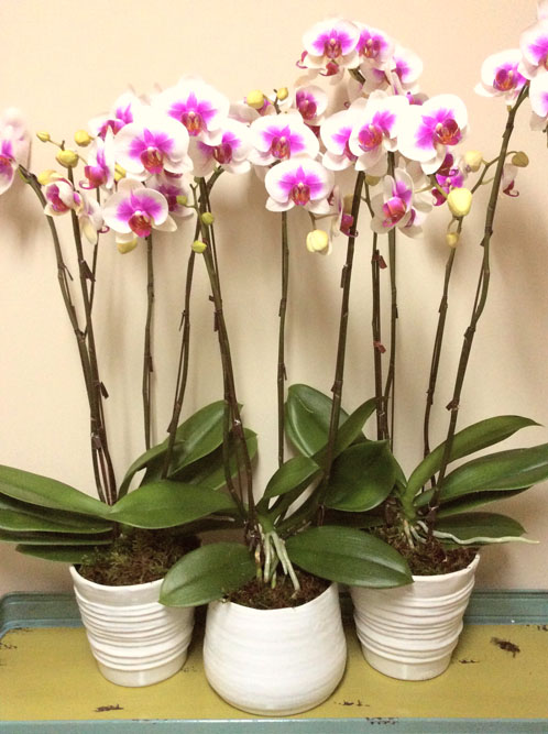 Most Orchids prefer a little drying out between watering. Just how dry depends on the variety. Most Orchid plants tolerate being dryer better than staying soggy. Allow the plants to approach dryness and apply sufficient water so that it drains freely through the container. This also helps to keep salts from building up in the potting media which could cause root burn. Never allow an Orchid to sit in water.