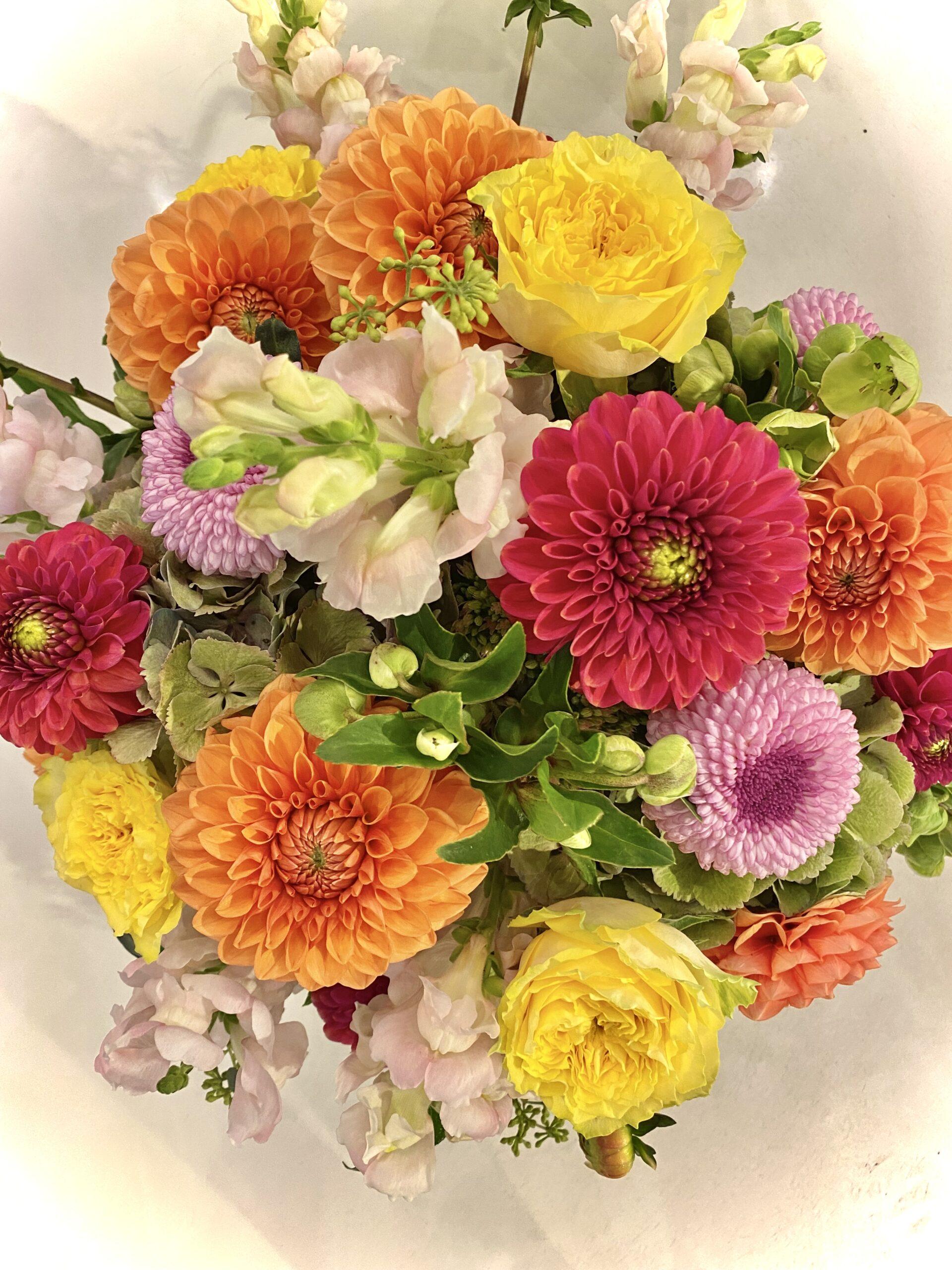 Bright bold, and full of life. Seasonal locally grown dahlias from our fresh cooler collection come together in a bouquet bursting with colour, energy, and floral magic.