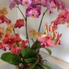 A graceful display of double stemmed waterfall phalaenopsis orchids potted in elegant white ceramic pot.
